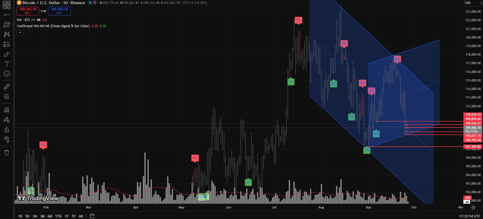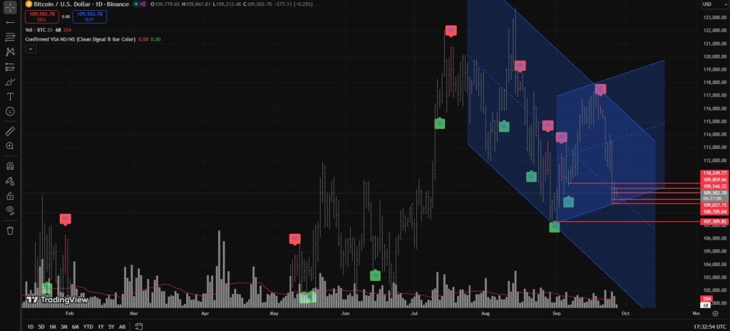 As of now, BTCUSD is trading around 109,859 with volume lower than the previous 5 bars. It looks like BTCUSD is testing supply after the September 25th wide spread down bar with ultra-high volume (UHV), which was followed by a small automatic rally (AR) on lower volume compared to the September 25th daily bar.