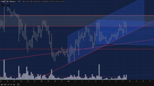 This week’s candle seems to be either retesting the upper trendline or trying to break out of it altogether.