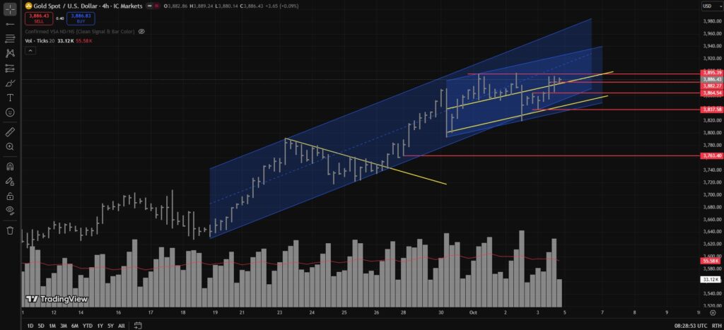 The strong close near the highs with low effort shows that Gold may be gearing up for a breakout above 3895–3896, as the remaining resistance looks fragile.