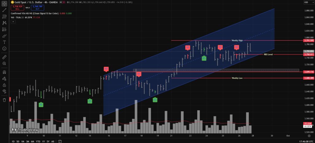 During the week of Sept 22–26, 2025, Gold printed a high near 3791, a low around 3680, and finally closed at 3759 for the week.